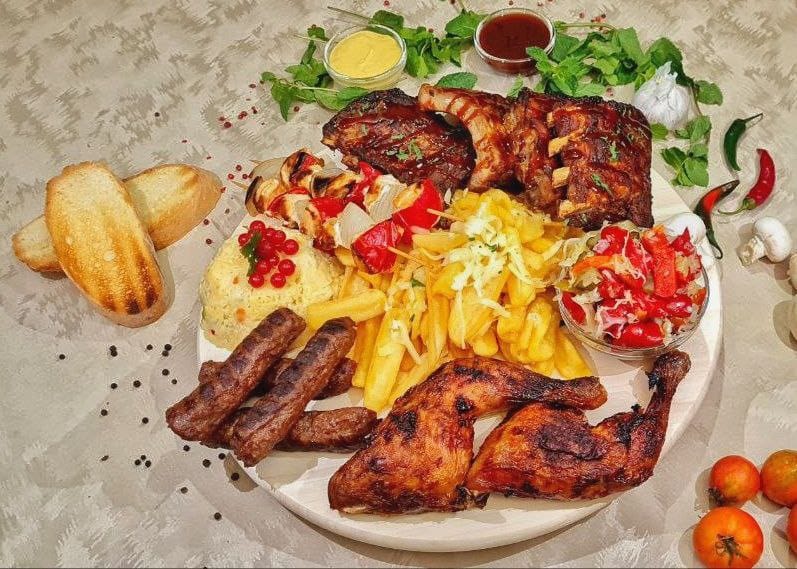 Contine: coaste de porc marinate 4 buc., pulpe de pui intregi 2 buc., mici vita-porc 4 buc., frigarui din piept de pui 2 buc., cartofi dippers cu usturoi si parmezan, orez cu legume, mustar, sos bbq, salata de muraturi.